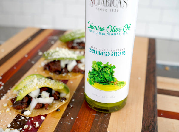Fresh cilantro is first cold pressed with just-harvested olives, crafting a savory fusion with overtones of ripe lemon, sage, and black pepper. Cilantro Extra Virgin Olive Oil adds zest to guacamole and zing to grilled chicken.